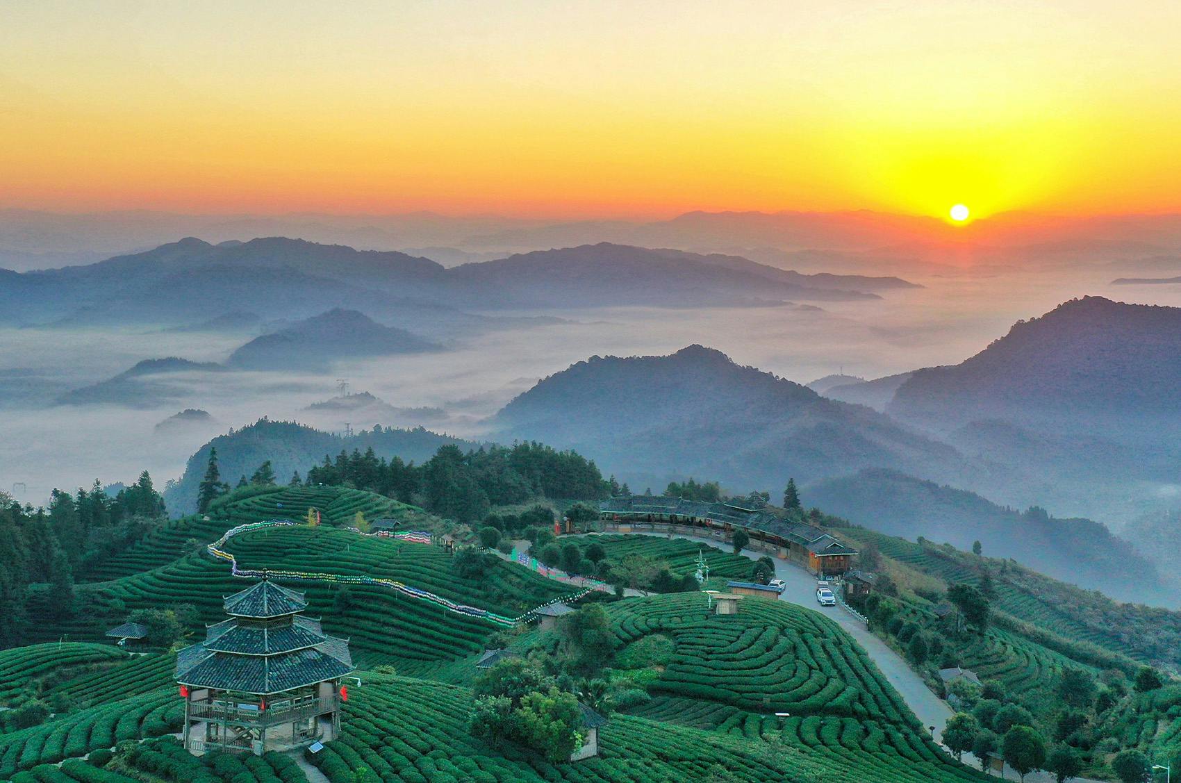 A breathtaking sunrise over misty mountains and lush green tea terraces, with a traditional Chinese pavilion in the foreground and rolling hills fading into the distance.